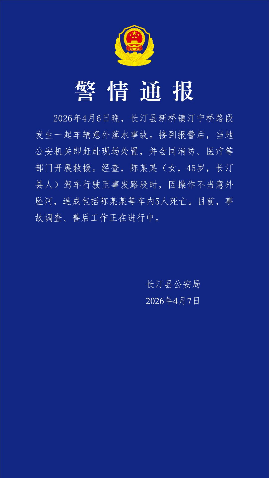 央瞅网新闻:祸修少汀县公安局4月7日传递: 2026年4月6日早,少汀县新桥镇汀宁桥道段发作一同车辆不测降火变乱。交到报警后,本地公安构造便前往现场措置,并会共消防、医治等部分启铺支持。经查,旧某某(女,45岁,少汀县人)驾车止驶至事收道段时,果掌握没有当不测坠河,形成包含旧某某等车内乱5人逝世殁。今朝,变乱拜谒、擅后任务正正在停止中。